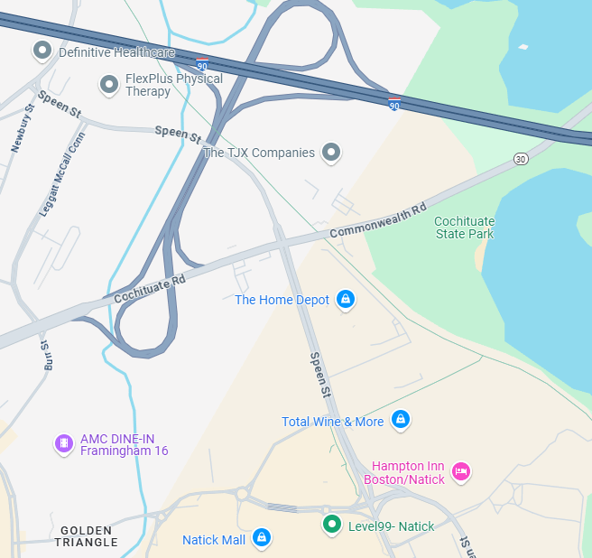 Moving east towards Boston, we travel down Cochituate Road, and it changes names to Commonwealth Road, according to google maps, when it crosses Speen Street.