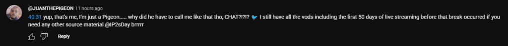 JUANTHEPIGEON formed as a result of Tech. I put in hard work into the live streaming industry and archiving the broadcasts, and over the course of that time, I became a Pigeon.